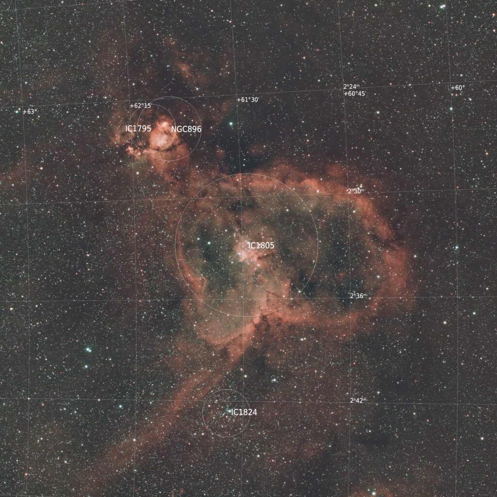 In pixinsight è presente una funzionalità che ci consente di annotare gli oggetti celesti presenti nel campo inquadrato. Per usufruire di questa funzionalità è necessario, preventivamente, eseguire un plate solve, ovvero “mappare” tutto quello presente nell’inquadratura. Una volta fatto questo, ci si può divertire e scovare nell’immagine tutto quello che abbiamo, magari inconsciamente, fotografato. Nell’immagine trovate un esempio fatto sulla nebulosa Cuore (IC 1805) e dintorni.